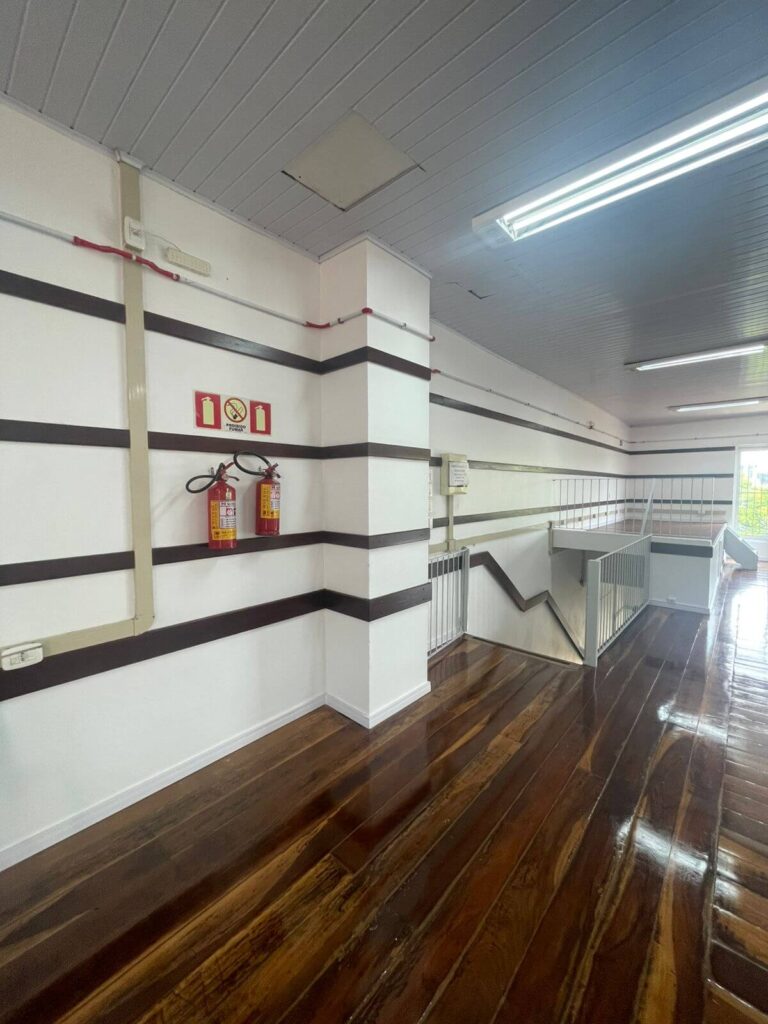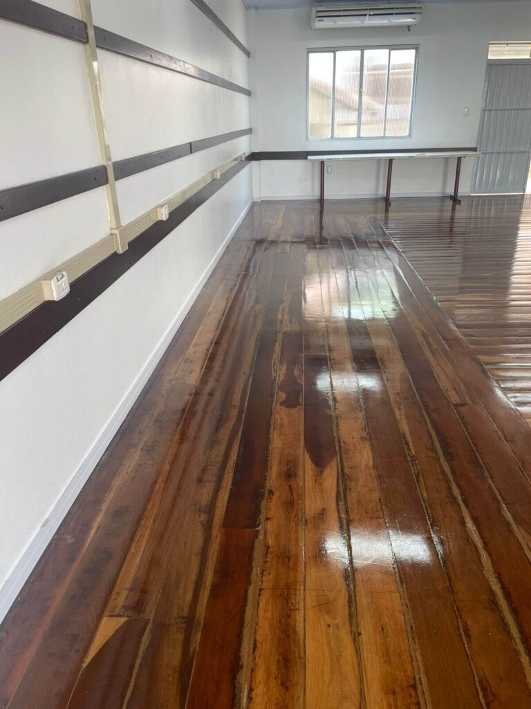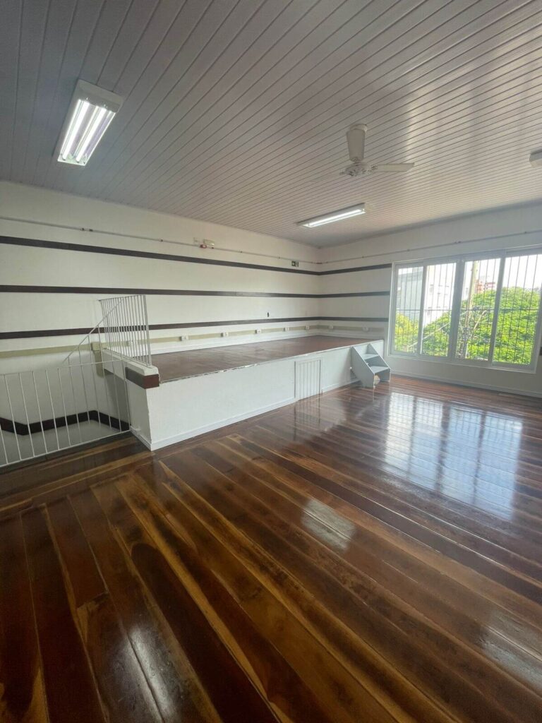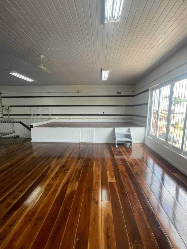 No interior do salão, a reforma contemplou a pintura de todas as paredes e da área de entrada, além da troca dos rodapés por modelos de poliestireno branco de 7 cm, garantindo melhor acabamento e maior durabilidade. As madeiras fixadas nas paredes receberam pintura em verniz, assim como o assoalho, que passou por reforma, fixação e revitalização completa.