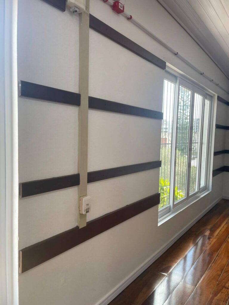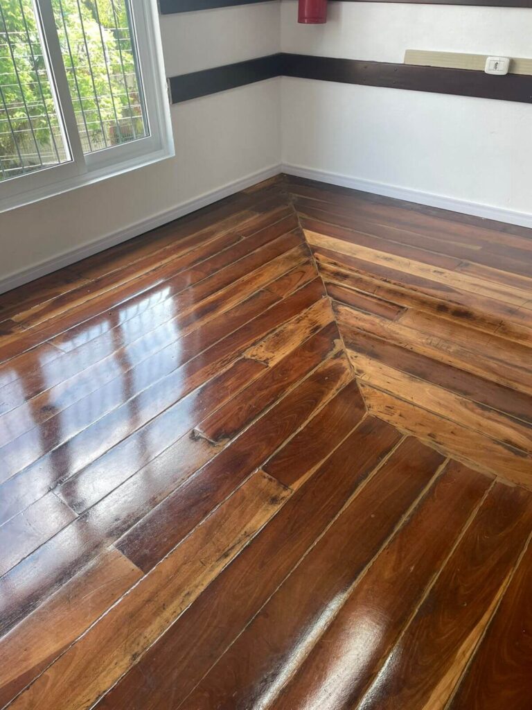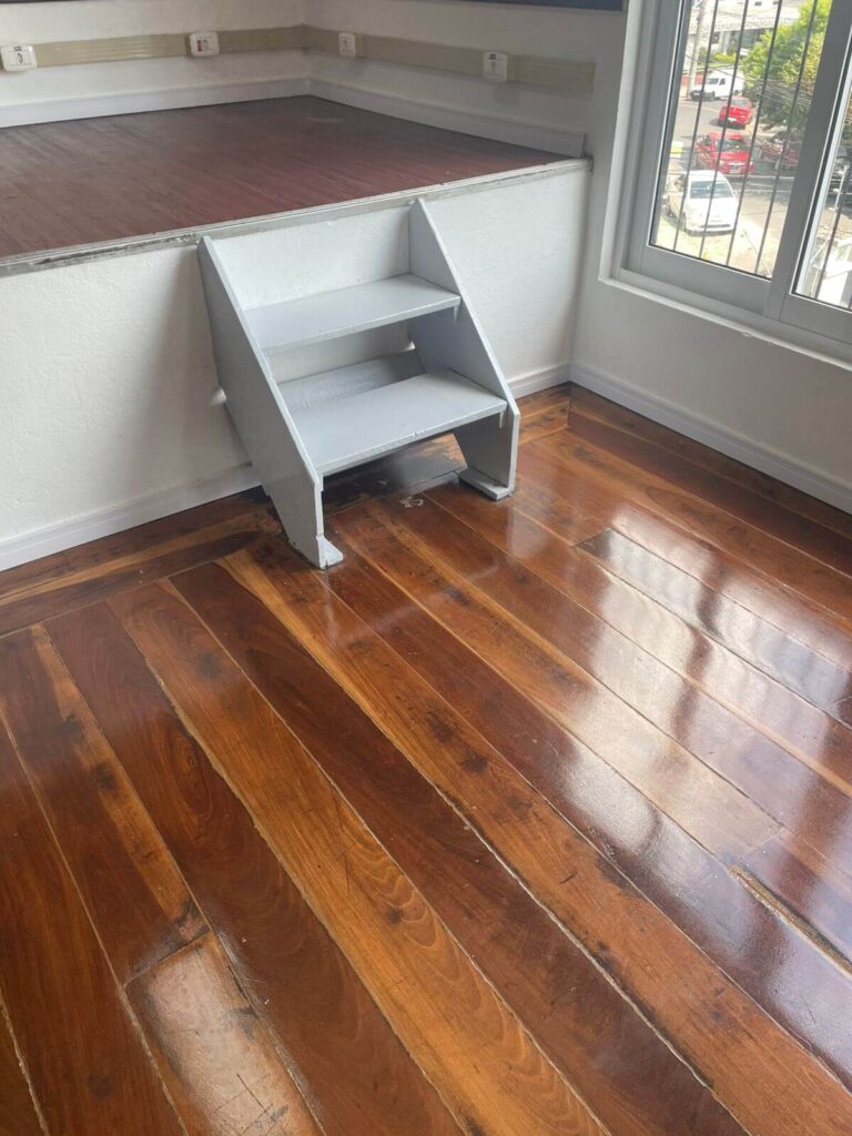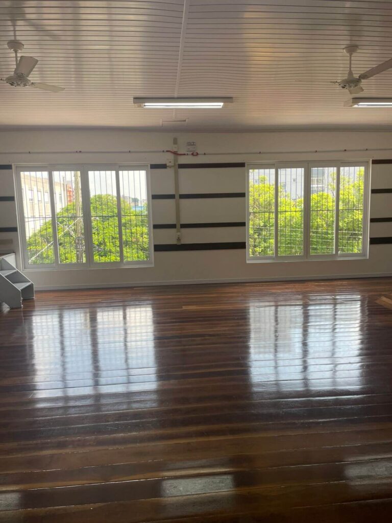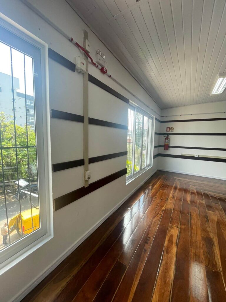No interior do salão, a reforma contemplou a pintura de todas as paredes e da área de entrada, além da troca dos rodapés por modelos de poliestireno branco de 7 cm, garantindo melhor acabamento e maior durabilidade. As madeiras fixadas nas paredes receberam pintura em verniz, assim como o assoalho, que passou por reforma, fixação e revitalização completa.