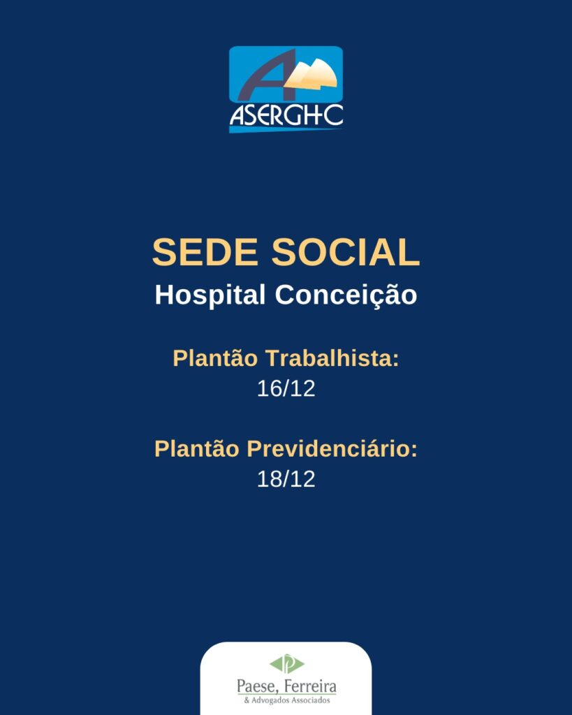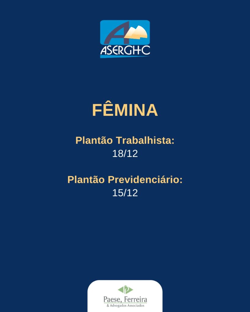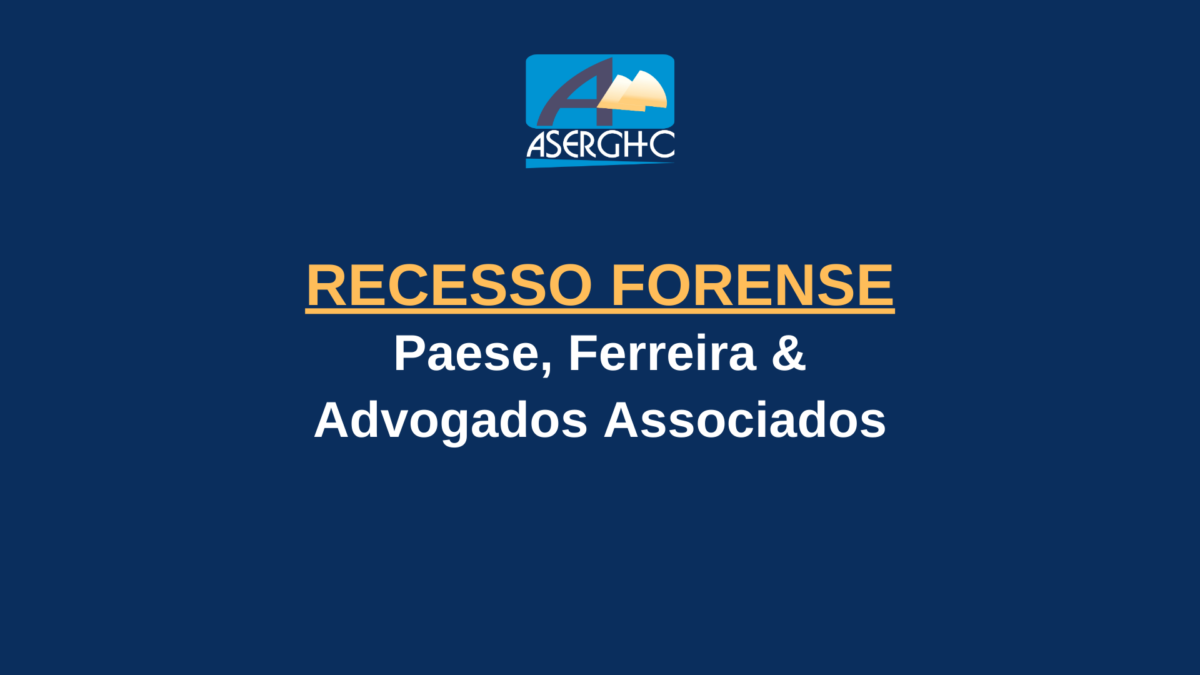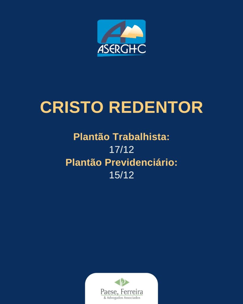 10/12/2025Em razão do recesso forense, que inicia no dia 20 de dezembro e se estende até 20 de janeiro, os atendimentos dos advogados do escritório Paese, Ferreira & Advogados Associados na ASERGHC também terão período de pausa, retornando a partir de 13 de janeiro de 2026.